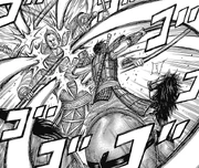 Immense Strength: Ba Tei possesses a strong physical prowess as his true forte lies in his overwhelming strength, making him one of key attackers in Ki Sui Army. He was able to ambush and overwhelm Shin during their first meeting. He further demonstrated his power as he killed cavalries from Gaku Kau Unit with ease.