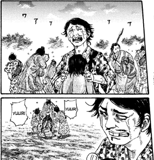 Half a month later, the Ouki Army, which had remained at the front lines out of caution, returned home. He is seen with a crying Tou Bi and looks over at Yuu Ri mourning for Bi Tou.