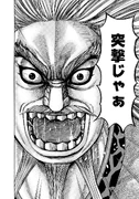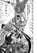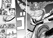 Just before the Battle of Kankoku Pass started Duke Hyou interrupt the speech of Rin Bu Kun by screaming CHARGE!!! and attacked the Zhao army in front of him. After he charged into the Zhao army, he notices that the battlefield had no “stench” so he reshuffled his men and charged again. When he noticed the movements of an army to his left in the distance, he charged over there. At this moment the Zhao Commander in Chief Kei Sha sent the Man Goku Army to attack the rear of the Duke Hyou Army who were exhausted from the first charge. When he noticed that Shin saved the rear he commends him and laughs at the thought that the person who inherited Ou Ki's Glaive is an Instinctual type like himself. He then had Kai Dou reorganize their formation and set his eyes back at Kei Sha in the back. When he finally was close enough to Keisha he retreated because the sun had set.