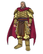 Duke Hyou was a large man with a warrior's build, grey, white hair, and large grey eyes that many called ferocious and beast-like, as well as sharp and fang like teeth. He has a long mustache and styles his beard into three long goatees. The Duke wore a red cloak on golden armor and wielded a glaive along with a spike rimmed shield.
