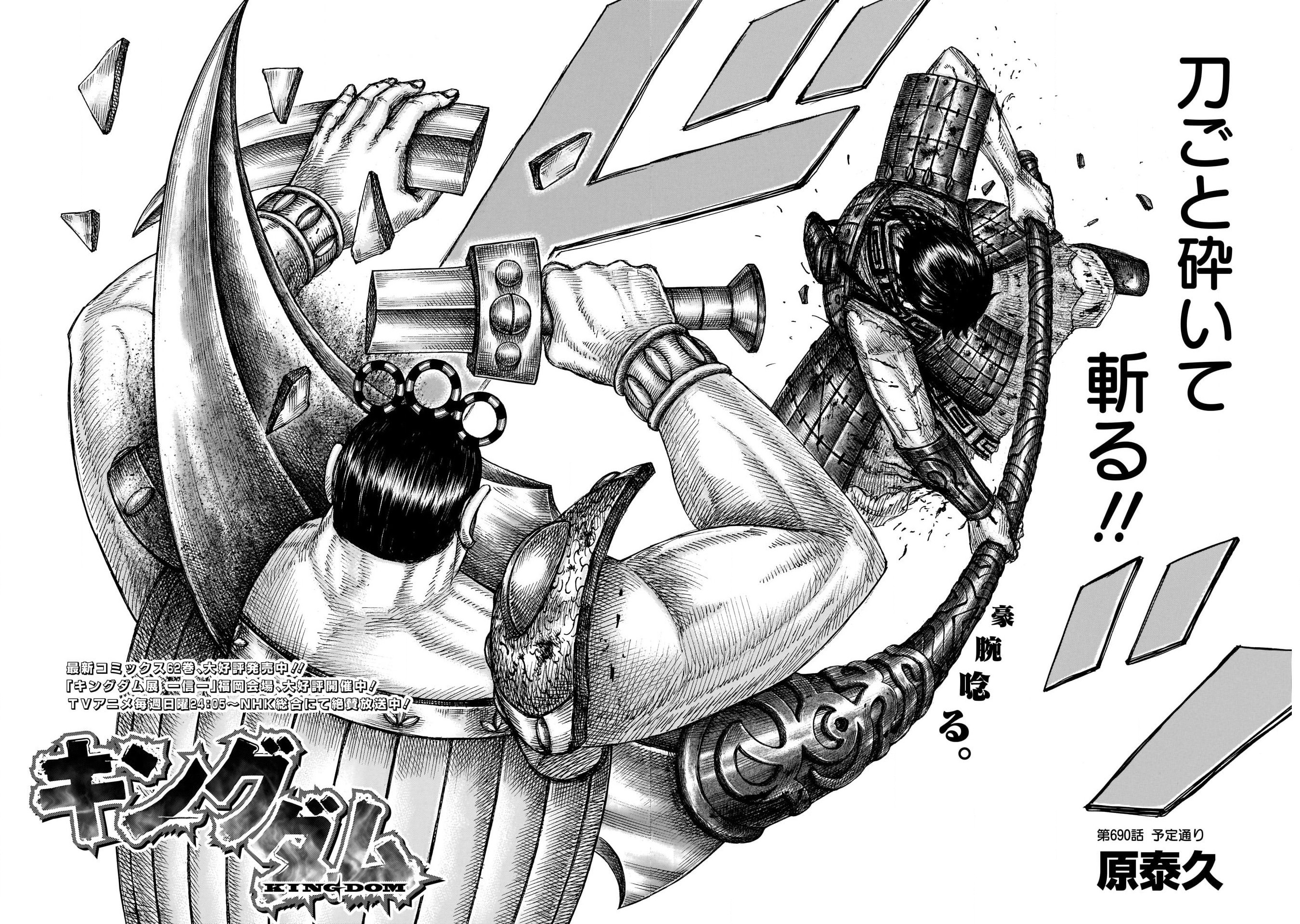 Gaku Haku starts punching and kicking Shin, changing his style again. His soldiers intervene and attack Shin too. In response Shin's troops try to help, but they are cut down by the general. Gaku Haku says Shin has a wholesome unit and talks how unity and camaraderie are pressures of the battlefield. According to him the war is humanity's height of entertainment and that's why they will never stop fight each other, especially those who are strong will start war after war. On the other hand, he finds pleasure in killing those type of people. Shin is disappointed and calls Gaku Haku apathetic. Gaku Haku responds that it's because Shin is young and lacks perspective in contrast to him and Ko Chou. Ko Chou bears the pain of war in him while Gaku Haku pleasure, pain and ecstasy of war. He adds that the world should stay like that. Shin disagrees with him as the battle continues. Shin then is kicked to the stomach and vomits blood. Zhao general thinks that whether you're killed by an intelligent invader or an idiot you are dead anyway, so it's pointless to think about it, but Shin has a different opinion.