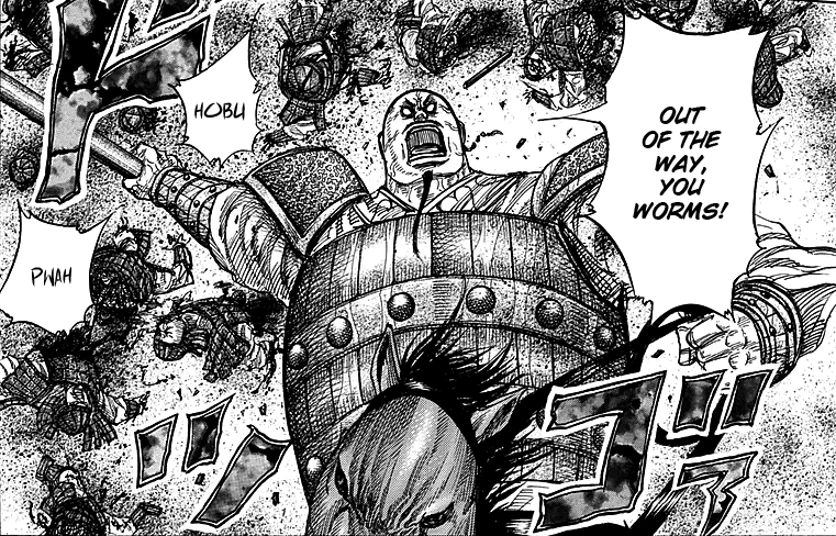 Kai Shi Bou is first seen along with the other Four Heavenly Kings when Ren Pa is sent by the Wei king to deal with the invading Qin. Shocked that his lord is not the Commander-in-Chief, he mocks Haku Ki Sai for his cowardice in the last Wei/Qin war. When Ren Pa explains the situation, he accepts it and does their pre-battle ritual before heading to his position.