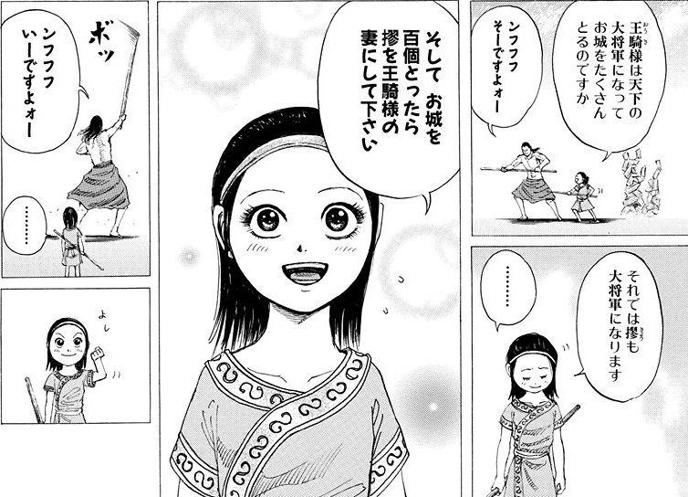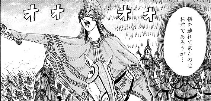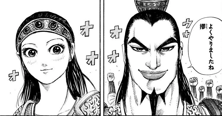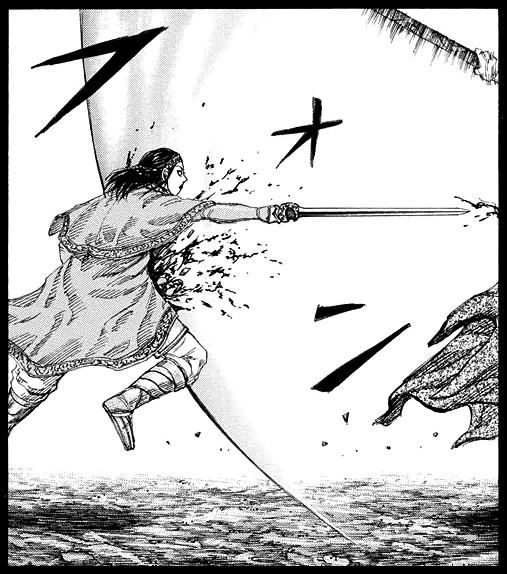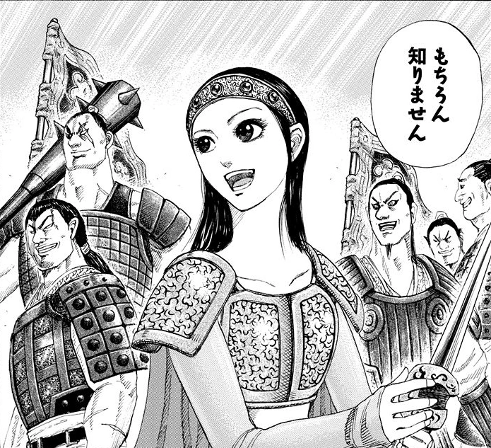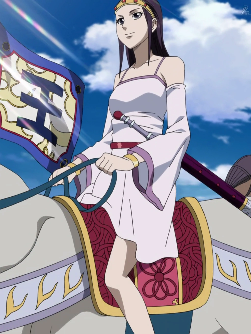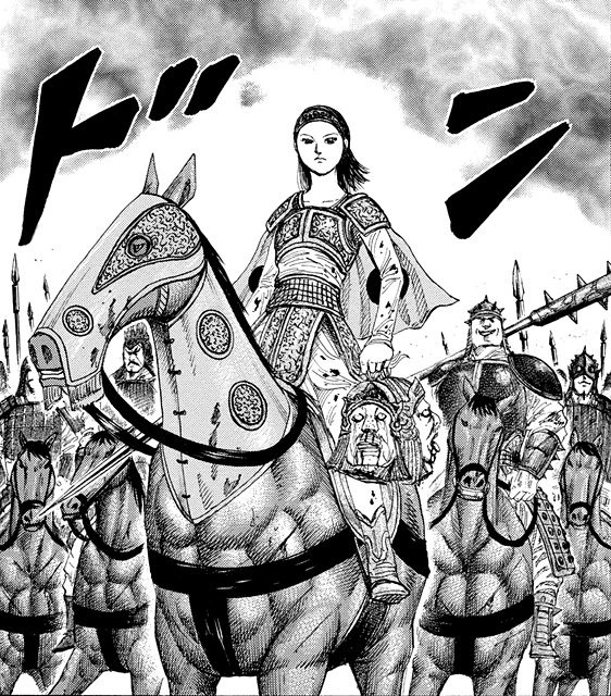 Sometime after, she was promoted to the rank of General due to her great deeds and merit, having her own army. With large armies under her command, she achieved great success on the battlefield and reached the same level as the other five Qin Great Generals a few years after her promotion. She was later appointed the sixth member of the Great Generals by King Sho and is given the ceremonial sword, as they both shed tears.