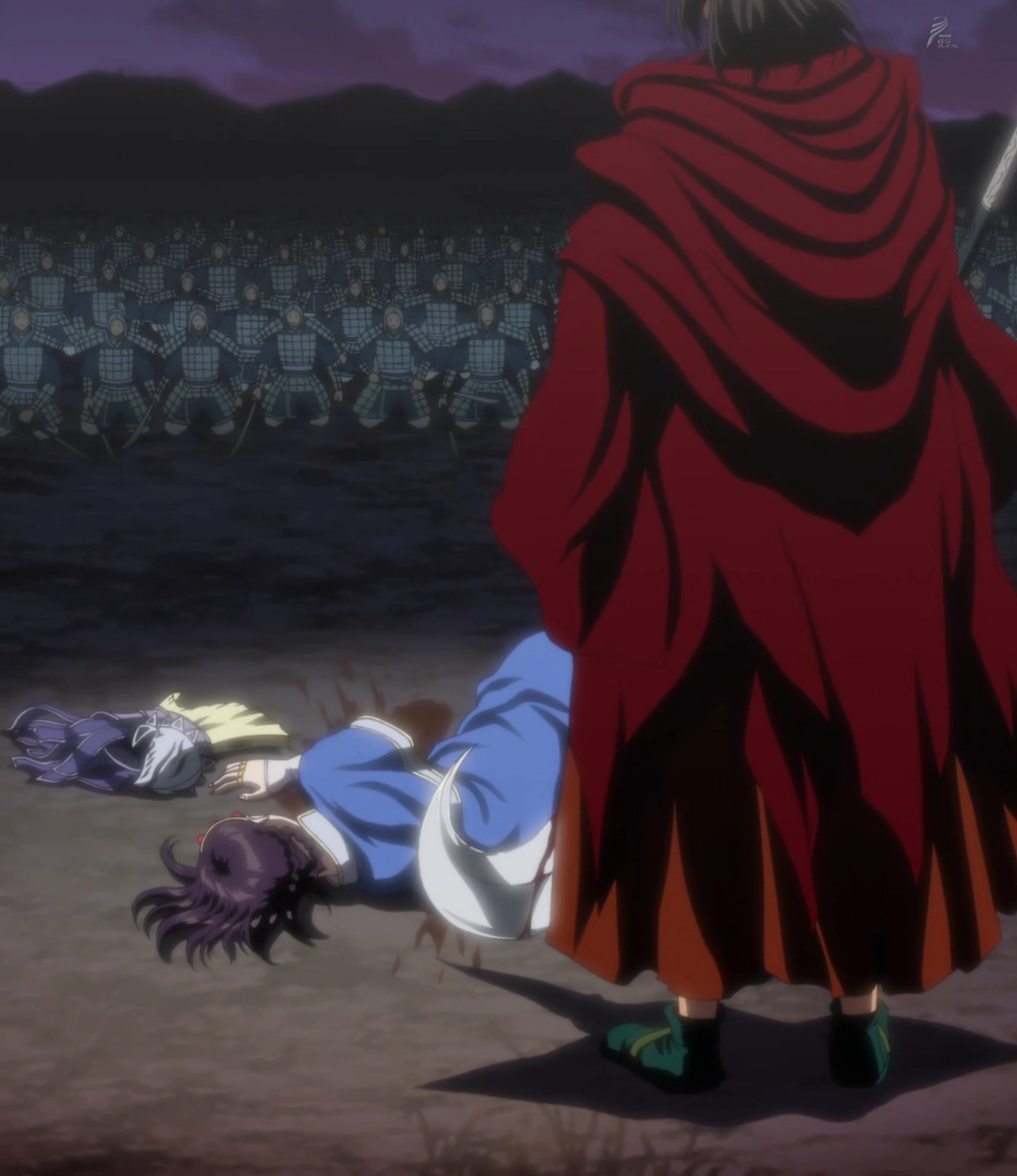 As her body fell to the ground, Ou Ki arrived at the scene and struck Hou Ken in a vengeful rage. In their brief duel, General Ou Ki slashed the Bushin's face apart, before quickly getting down from his horse to check on his beloved, letting the crossbowmen corps finish off the defeated assailant. As Kyou's killer was seemingly killed and left to rot in the field of battle, Ou Ki and Shou Bun Kun were forced to hide the fact that the Great General had been defeated by the unknown man, in order not to harm the campaign. And so, the pair spread the rumor that Kyou died in bed due to illness. Nine years later, however, when Hou Ken reemerged as the head of an invading Zhao army, Shou Bun Kun was forced to reveal the truth of her death to the royal court of Qin, letting them know what they were really up against.