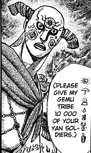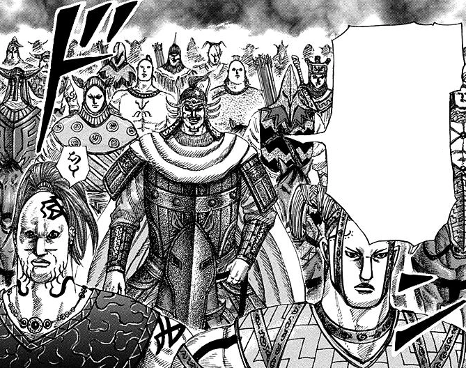 Ordo was appointed as a Great General and was attacking the eastern border of Zhao when the Zhao had all their forces gathered near the region of Koku You to fight the Qin. He is wondering, how Ri Boku will react in this situation. He seized multiple cities and castles on his way until he turned his eyes towards Seika. But Shi Ba Shou, with only a handful of elite Seika Army, held him into a standstill, while Zhao general Chou Haku captured Yan cities behind Ordo, forcing him to retreat and attack the siege force.