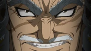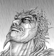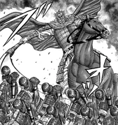 Shin talks back to him but he dismiess Shin and that he needs to get a name "worth his time" before the Qin commander throws one of Rin Ko's swords at his feet, stating he slew the Heavenly King. In his rage, he attacks Shin and is surprised when the boy can block his blow, wondering what kind of sword he wields before knocking him back. After listening to Mou Gou's words, he remembers that Ou Ki said something similar about the end of their golden age when he visited many years back. He raises his weapon to kill Shin but stops when Mou Gou tells him that Shin inherited Ou Ki's Glaive.