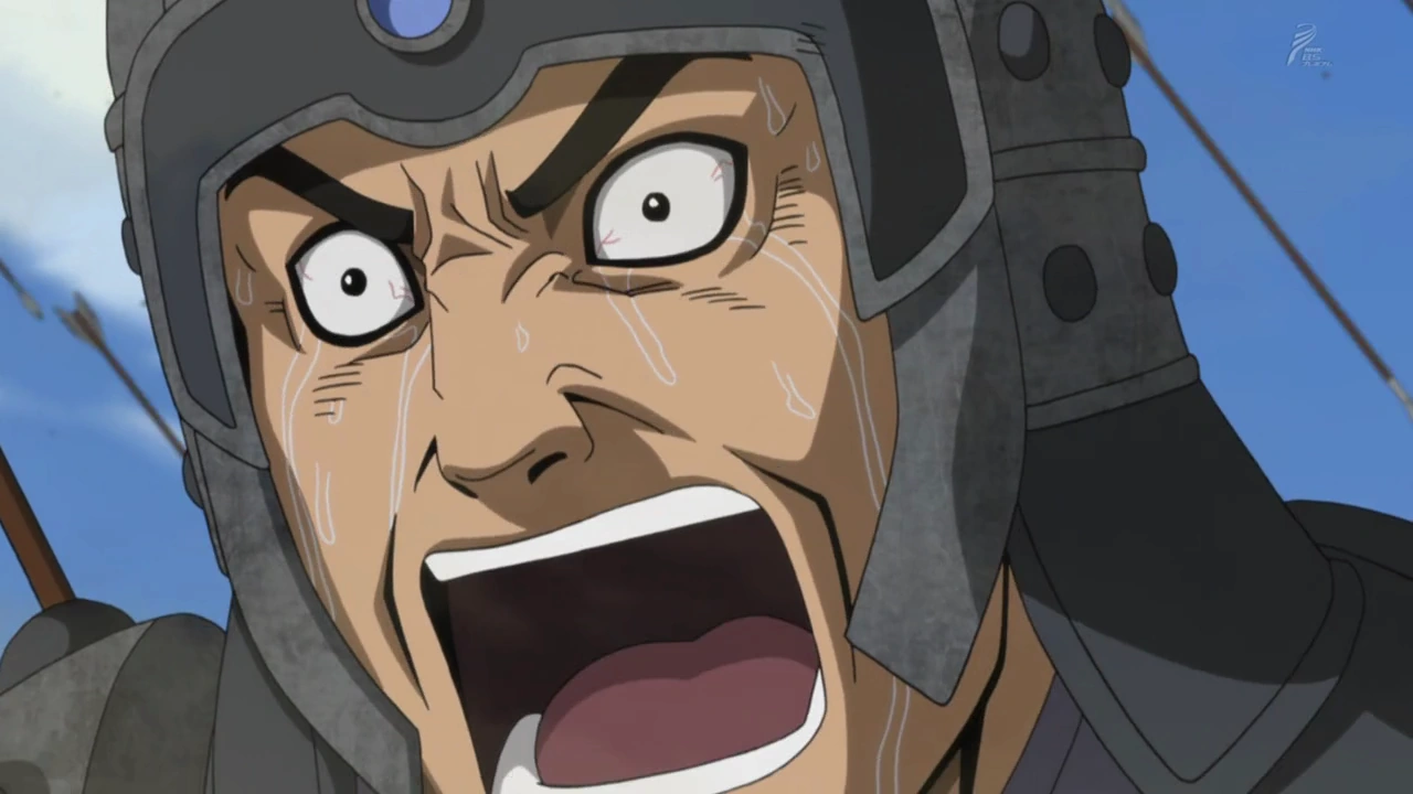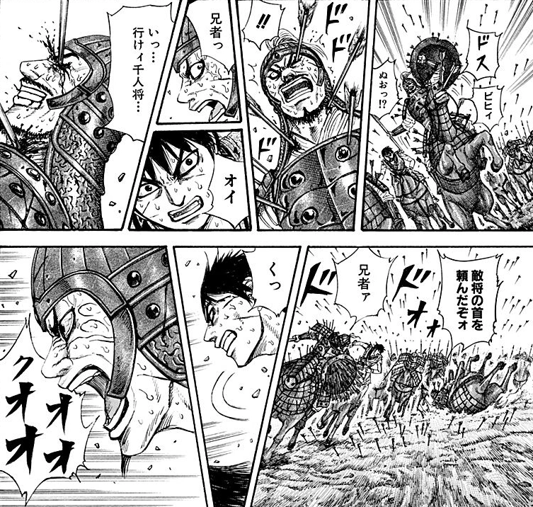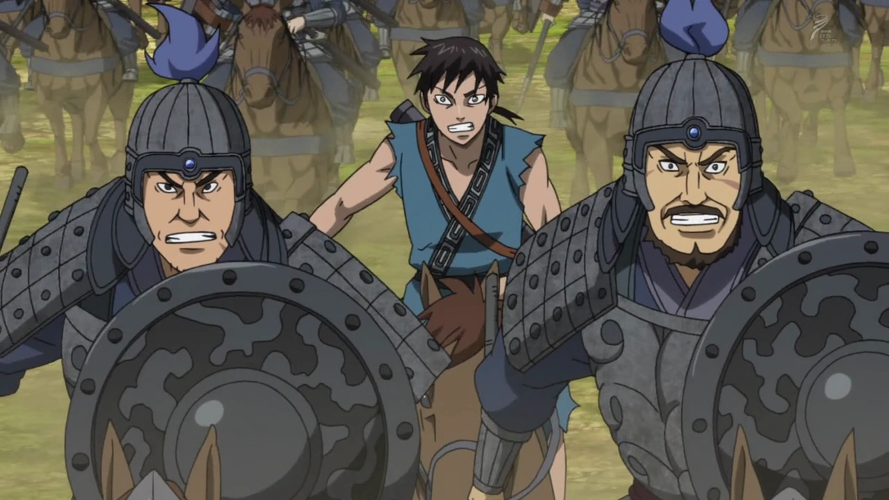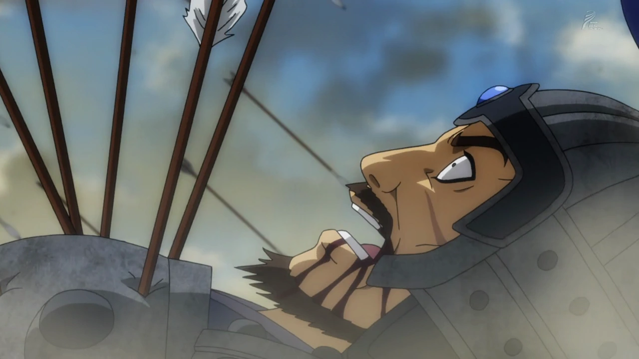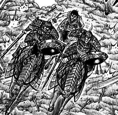 During the confrontation with Gen Pou Army, the brothers accompanied Shin's cavalry charge and after they were discovered and arrows were fired at them, on So Sui's orders, they rushed forward to absorb all the arrows and protect Shin. During the shelling, the elder brother was struck in the eye and neck by an arrow and, after wishing him luck, fell to the ground. A few seconds later, the younger brother was knocked from his saddle, landing on pre-prepared stakes jutting from the ground. After the trap, he was finished off by Gen Pou's soldiers, along with many other dismounted riders.