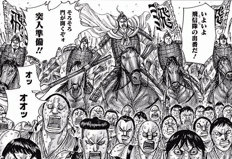 As the Qin troops approached the city of Retsubi, he witnessed the siege and casualties of the allied army of Yo Tan Wa, unable to restrain himself and burst forth in full view. Later, he and other newcomers rushed through the open gates of the city and, taking up a position near them, prepared for battle. Unable to contain his fear and stress, and despite the orders of his squad leader, Kou, he rushed towards Zhao's soldiers with screams, but was quickly knocked down and beheaded.