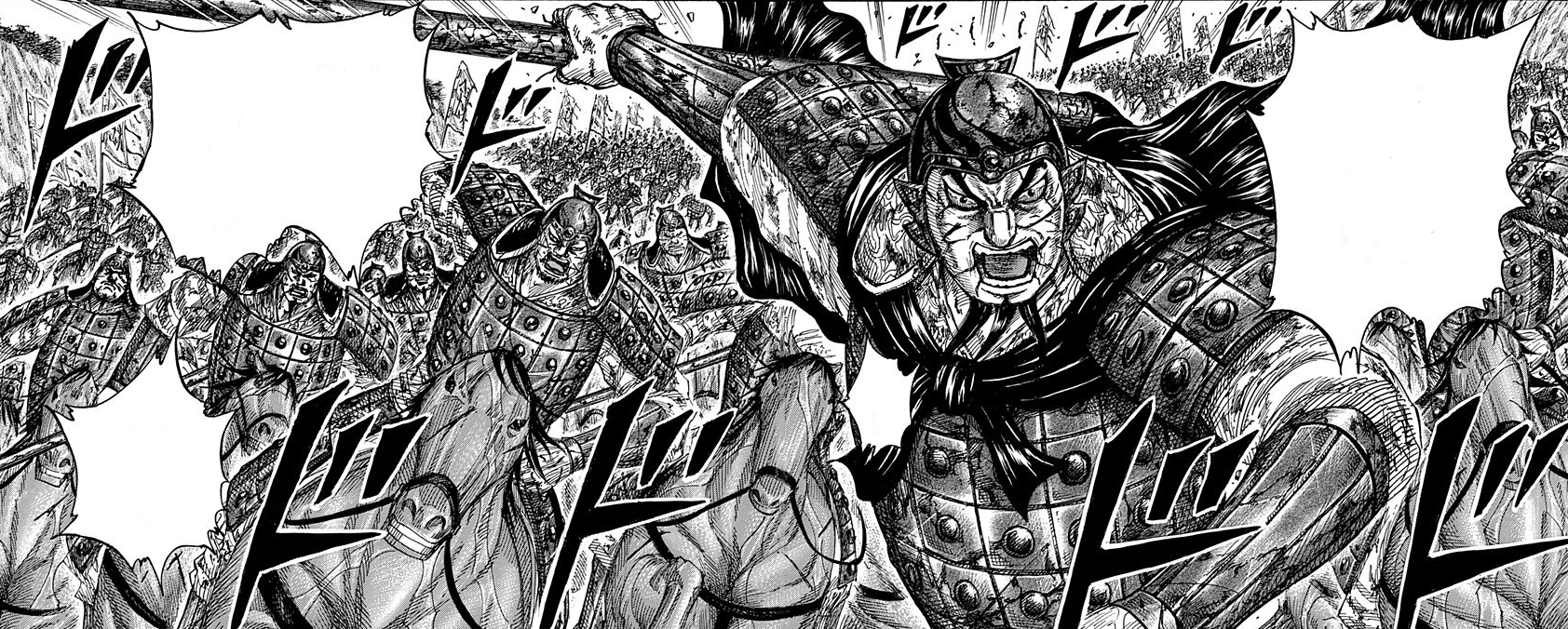 He was inserted Mou Bu Army, acting as Mou Bu's advisor. But mostly, the hot-blooded general charged through Chou Sou and Ri Haku's trap. It took Ou Ki's effort to rescue them, costing the last of the Qin's Six Greats.