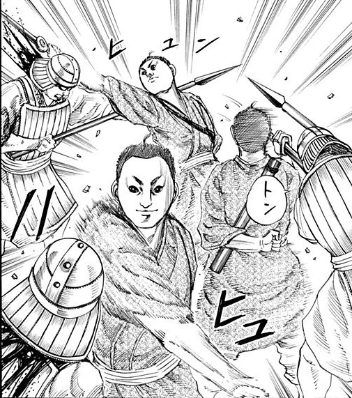 When they reach Bayou instead of charging the city, they advance right. To avoid fighting on the open field with Zhao cavalry. Instead of charging with the left army, they are assigned by General Ou Ki personally to flank the Zhao forces while they are engaged in combat with the Qin Left Army and take General Fuu Ki’s head in the midst of the confusion.