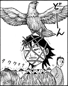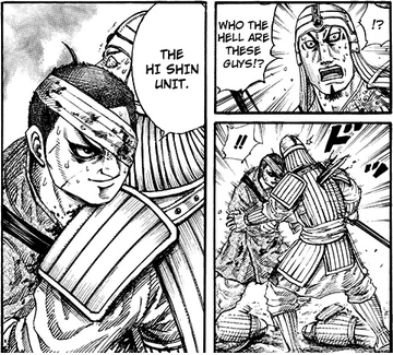 As Ouki is about to finish off Houken, he stops, and everyone hears rumbling. They are then surrounded by a huge Zhao army with a Great Heavens flag. The 2000-3000 spectators collapsed in an instant. And the location devolved into a huge melee with cavalry and infantry alike. The Hi Shin Unit then starts blowing through the Zhao. When a Zhao soldier asks who they are, Suu Gen tells him "the Hi Shin Unit." after stabbing him.