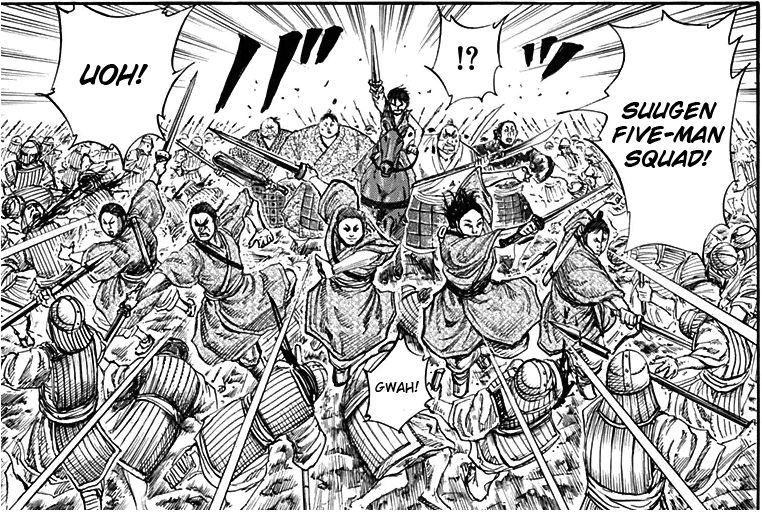 When they break through, they meet Fuu Ki’s elite bodyguards. After assessing their strength, he tells everyone to watch out because every one of them is strong. Shin then dismounts slaying a great number of them, as does Kyou Kai. They then follow their officers’ lead, then Shin splits the unit in half taking the squads that can still run, fight, and still have energy in them.