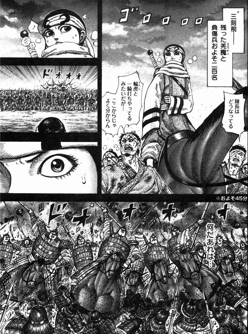 While he was recovering, he told Shin and Kyo Gai what had happened to them, explaining that the enemy cavalry was very strong and they were powerless, but Lieutenant Kyou Kai had selflessly charged into battle alone, ultimately defeating the enemy. Tai Kan didn't have time to tell more, nor did he mention that Kyou Kai had survived, as Tai Kan had died of his wounds.