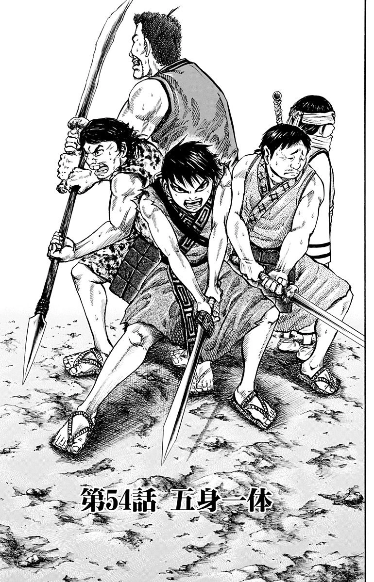 While being split up, they are put in the Baku Koshin Unit. While in the very front everyone starts to get very nervous, except for Shin. Taku then informs them most people in the first rank die during the initial clash of the battle, and they must do whatever it takes to survive the first charge. But Bi Tou starts to doubt their chances. Then Taku tells them that he has never lost a single squad member. He tells them to stay within ten steps of each other. If they always stand back-to-back, they can cover each other’s blind spots. They will attack as five and defend as five. Even against a wounded opponent, they will strike him down together.