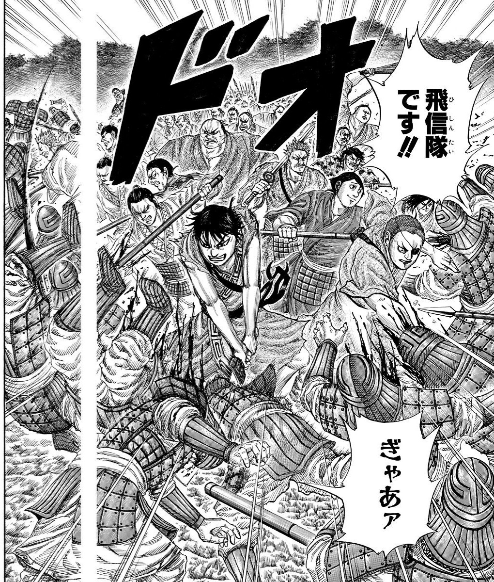 When the Battle at Dakan Plains started they charge the Wei who was using the Rock Formation, but Shin runs to very front and jumps over the formation killing a great number of Wei and opening a path for the Qin.