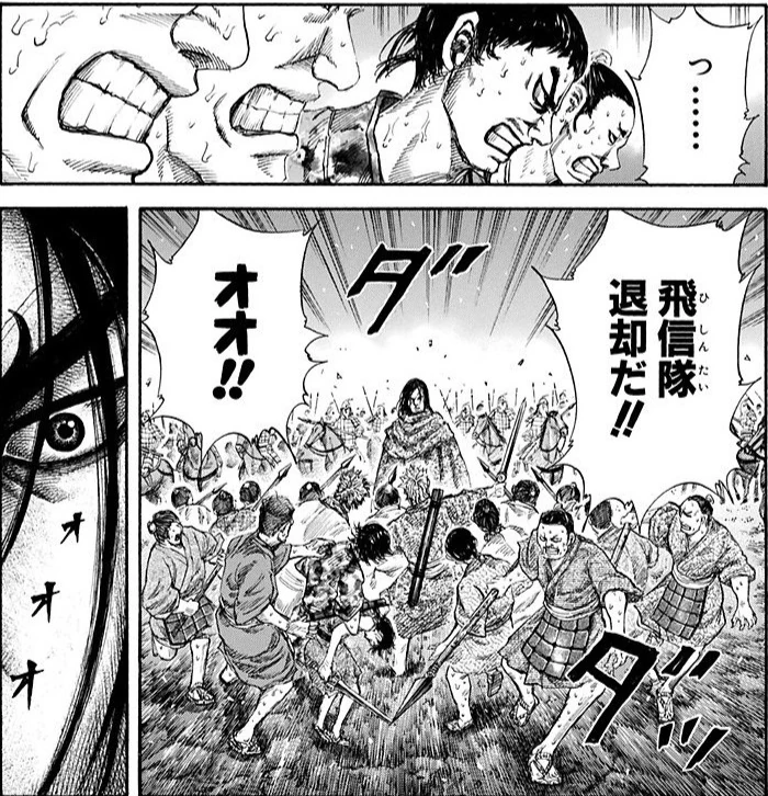 Then while fighting Fuu Ki’s elite guard unit, Shin is encouraged by En and Taku to leave them behind and splits the unit in half taking the squads that can still run, fight, and still have energy in them.