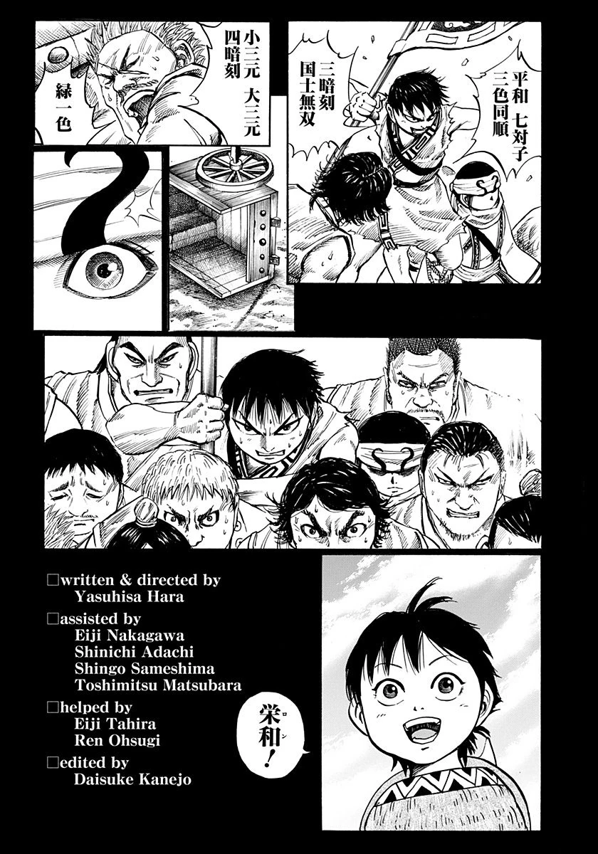 A few days later, the Hi Shin Unit was folded into the 4th army to hit the Zhao HQ with their whole army. They then charged the foot of the mountain to set up their HQ. Then they see that the Zhao had practically made it into a fortress. When they enter the Zhao start retreating. Den Ei notices that the Zhao were already long gone by the time they got there. And have moved their HQ and soldiers to a new location. That night they camp in the mountains with the with the rest of the Army. They are then informed that the Zhao have attacked. When they are formed into ranks, a giant man jumps from a hill, and starts slaughtering the unit. Shin then begins to duel him, then Kyou Kai appears. He then tells them his name is Hou Ken, the Zhao Army’s Commander-in-Chief. Shin and Kyou Kai pincer Houken. Shin is quickly blown away by Houken. Then he fights Kyou Kai, and they have a fierce duel. Then 500 Zhao arrive under the command of Man Goku. Shin then rises and orders his to fall back and regroup, while Shin and Kyou Kai cover them. Instead, the Kan Ou Army shows up and attacks the Zhao. During the chaos, everyone slowly finds their way back to Shin. When Shin wants them to fight Houken, Suu Gen tells him that he understands his feelings, but he should take a minute to calm down and think it through. And they cannot defeat him by blindly charging like that. If they were to fail in their gambit after entering the middle of that, there’s no doubt their unit will be annihilated. Shin reminds him of when they took Fuu Ki’s head, and how many of their men gave up their lives so they could take it. And how their center and right armies sacrificed thousands, and what they had to show for it. That is what war is. But right now, the Zhao Commander-in-Chief was right in front of them. But he agrees with him, so he asks if anyone wants to pull out. Shin has everyone apart from him and Seki’s squad split into three groups. Take position surrounding Houken from three directions. Gathering as many of the nearby spears as possible. Then hold position and wait for the signal. On Seki’s whistle signal, all three groups made a beeline for Houken. Then throw spears at him from all three directions. He deflected all of them, but while he deflected them Shin snuck up on him from behind. He still noticed him, but Shin knew he would and dodged the swing. When he goes to cut him, Shin knew that Houken would still notice and go for another swing, so he dodged it and slashed him. But it didn’t work. Before he could make another move, he is hit by the backend of his glaive. And before Houken can kill Shin, Kyou Kai protects him, and is blow away. Then as he goes to kill Shin, he is protected by the Bi brothers and Taku. Then the unit comes to their aid. Then they retreat. They are then chased down by Man Goku. While on the run, Den Ei tells Bi Tou to hang on to him no matter what, because it doesn’t matter how many of them die, so long as he stays alive the Hi Shin Unit will never die. Then they are attacked by Man Hoku. The Bi brothers manage to get Shin out. Hai Rou goes to Man Goku to buy Shin time, and says to him if he really thinks that a half assed blockade is enough? And they are the Hi Shin Unit that blew right through the Fuu Ki Army of 20,000 before taking his head, and if he underestimates them, they’ll take his head. Mangoku tells him to try it. Hai Rou then tells him that the Hi Shin Unit won't die there. They then retreat. The next morning, they find the others after hearing Seki’s whistle. Bi Hei tells everyone Shin will be fine in Tou’s hands. He tells them to send out search teams, and he has a pretty good idea what direction they’re in. But Seki tells them Shin has returned, carrying a Bi Tou. As everyone is relieved of their return, Shin tells Hei he’s sorry. And lays a lifeless Bi Tou down.